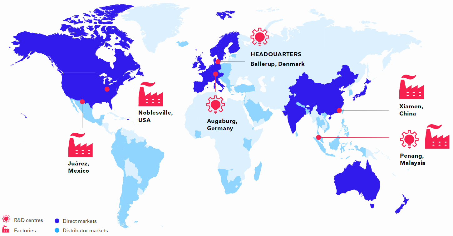 Con sede en Dinamarca, nuestro equipo está distribuido por América del Norte, Europa, Asia Pacífico y América Latina, con centros de producción en EE. UU., China, Malasia y México.